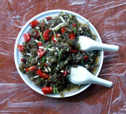 【 酸辣子炒沙蘿菇 】 當(dāng)?shù)卮合募居旰螅筋^巖石壁上生長(zhǎng)的墨綠色地菇——地衣(本地名為沙蘿菇),采集后用清水反復(fù)多沖洗幾次。再用壇子腌的酸辣椒和大蒜一起炒熟,出鍋后灑些許香蔥即成一道色、香、味俱全的地方特色小吃。