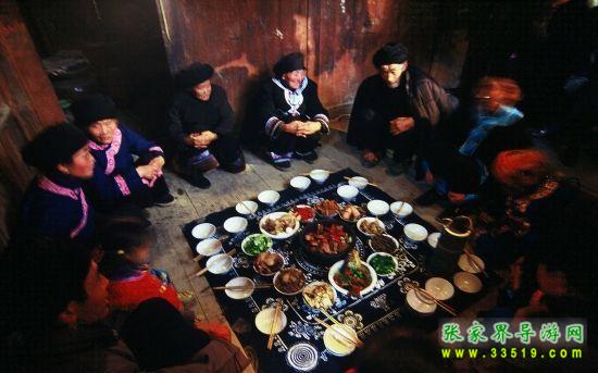 聚居于湘鄂川黔的土家族人過年,比其他民族要提前一二天。俗規(guī)農(nóng)歷臘月大,二十九過年,臘月小,則二十八過年,稱為過“趕年”。 土家族有著趕年的習(xí)俗,在農(nóng)歷臘月三十的早晨,土家族家家門口,都是紅燈高掛,鞭炮齊鳴。因?yàn)槟鞘峭良易迦碎_始趕年的時(shí)候,開始吃午餐的時(shí)候。 土家人趕年時(shí),先把菜全部上桌后,再盛一碗飯,加一些葷菜,飯碗上放一雙筷子,那時(shí)土家人先祭拜他們的祖先,然后家人上桌開始趕年。土家人年餐菜都必須是自家養(yǎng)的和自家產(chǎn)的,自家養(yǎng)的如豬、牛、羊、魚等,自家產(chǎn)的如紅薯粉、黃豆、青菜等等。 土家人的趕年餐每道菜都有它的含義。 土家三樣(血豆腐、臘豬干、臘香腸):當(dāng)土家兒女在桌上看到這三道菜時(shí)就會(huì)體會(huì)到父母一年來的辛勞。 土家紅曲魚:這意味著年年有余。 大塊豬頭肉:豬頭肉在沒有切碎之前,先祭拜自家的祖先,然后切好上桌,是土家人在桌上吃的第一道菜,所以也稱為土家第一肉。大塊臘肉在土家族是流行 365 天,無論你走在土家族哪一個(gè)村寨,餐桌上都少不了一碗大塊臘肉,這表示著土家漢子能吃能做,也意味著土家人對貴客的熱情招待。 香菇燉雞:一般在農(nóng)村土家父母平時(shí)總是舍不得宰殺自家的老母雞,因?yàn)檫@時(shí)候他們會(huì)想到身在他鄉(xiāng)的兒女們都在百忙的工作中,很少用高營養(yǎng)的東西補(bǔ)給自己的身體。所以只有等到農(nóng)歷臘月三十也就是土家族趕年時(shí),土家父母才能盼到兒女們的團(tuán)聚,這時(shí)候就會(huì)毫不猶豫的將老母雞燉給兒女們吃。 另外,土家人年餐桌上都會(huì)有青菜、豆腐,這是意味著土家父母叫兒女們在外面做事平平安安、清清白白。 土家趕年餐全席食譜 第一道:土家臘豬肝 (原料:自制臘豬肝,自制鹽菜) 第二道:土家血豆腐 (原料:自制豆腐,花椒,辣子,陳皮) 第三道:土家香腸 (原料:豬小腸,瘦肉,花椒,辣子,陳皮) 第四道:土家紅曲魚(火鍋)(原料: 7 斤以上的草魚,紅曲魚) 第五道:大塊豬頭肉 (原料:臘豬頭肉,干蔥頭) 第六道:大塊臘肉 (原料:自制臘肉,大蒜頭) 第七道:香菇燉雞 (原料:自產(chǎn)蘑菇,自養(yǎng)土雞) 第八道:雞湯紅薯粉 (原料:自制高湯,正宗紅薯粉絲) 第九道:米湯青菜 (原料:青排菜,米湯) 第十道:煎大塊豆腐 (原料:自制豆腐) 第十一道:土家美點(diǎn) (原料:粘米粉,糯米粉,黃豆粉,紅糖) 第十二道:農(nóng)家水果拼盤 (原料:各種水果)