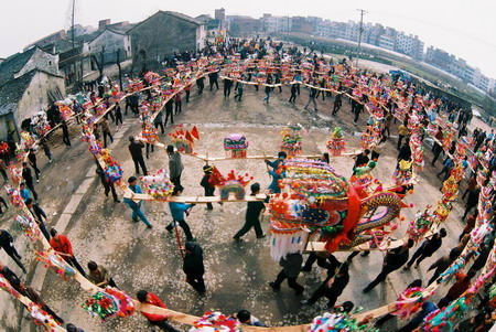 龍舞是中國(guó)民間體育藝術(shù)。大庸境內(nèi)的板凳龍是 別具一格的龍舞形式。尤其桑植縣白族人民,對(duì)舞板 凳龍有著特殊偏愛。 白族同胞耍板凳龍,相傳起于漢代,由白族先民 “舞龍求雨”的宗教活動(dòng)演變而來(lái)。 板凳龍有兩種樣式。一種是簡(jiǎn)式板凳龍,由二個(gè) 舉長(zhǎng)凳為頭,一人在后選適當(dāng)“舞臺(tái)”表演;另一種 是“篾扎板凳龍”,即用竹篾扎成龍形置于板凳之上 ,以木腳示龍爪,造型美觀,逼真。耍板凳龍又分兩 種舞式,一為獨(dú)凳龍,一為九節(jié)龍(九張板凳相接)。 舞板凳龍動(dòng)作有“二龍搶珠”、“黃龍穿花”、“二 龍戲水”、“金蟬脫殼”、“黃龍盤身”等。永順、 慈利還流行草把龍,其龍耳稻草扎成。龍舞還有“干 龍”、“濕龍”之分,“干龍”多為娛樂(lè),“濕龍” 則為求雨。“龍”到之處,百姓必潑水助威,舞者一 身透濕,盛為熱烈歡快。