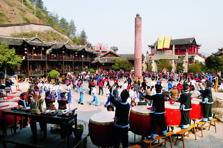 三棒鼓,唐代稱三仗鼓,明沈行符《顧曲雜言》 曰:“吳下何來(lái)有打三棒鼓乞錢者,余幼時(shí)有見之也, 起于唐咸通中(公元865年)”約于明代傳入本境, 并逐漸成為群眾增聞樂(lè)見的民間藝術(shù)形式。每年春節(jié) ,藝人們結(jié)伴走村竄寨拜年,表演對(duì)象不分貧富,戶 戶必到。如遇貧寒之家,表演者將別家贈(zèng)送禮品相送 ,意在人人過(guò)節(jié)歡喜。充分體現(xiàn)出土家族人熱情好客 ,心地善良的民族性格,對(duì)加強(qiáng)民族團(tuán)結(jié)有一定作用 。 三棒鼓通常由三至五人組成,一人擊鼓唱詞,一 人鑼鈸配樂(lè),一人?;ò??;ò羧?,長(zhǎng)一尺,舞者 左右手各持一根,將另一根拋在空中,左右開弓,擊 打空中花棒使之不落地。也有以刀代棒,以五刀代三 棒的技藝。技藝高強(qiáng)者,突然把刀拋得極高,來(lái)一個(gè) 眼花繚亂,不禁稱絕。打三棒鼓,通常有“鬧春耕” 、“收割打場(chǎng)”、“慶豐收”、“拜年節(jié)”四套,分 “鯉魚跳龍門”、“玉女穿梭”、“板巖漂灘”等項(xiàng) 目。打三棒鼓技巧性強(qiáng),表演時(shí)需高度集中,用力適 當(dāng),貫通一氣,并與演唱者默默配合。
