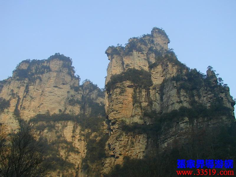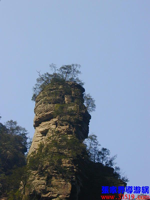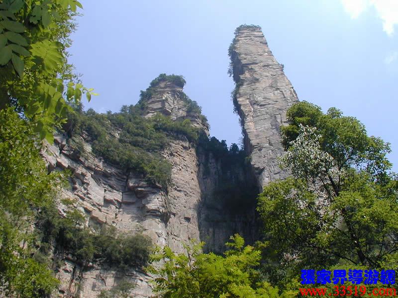 (金鞭巖、神鷹護(hù)鞭)如果要問張家界國家森林公園的標(biāo)志景點(diǎn),答案是現(xiàn)成的:金鞭巖。早在清代中期,一些文人就把張家界的峰林及百丈峽列入“永定八景”。其一叫“危峽啼猿”;其二叫“層巖涌塔”:“縣西二十里青崖山,其前五山并立,層峙如浮圖。中一峰更峻拔,上插宵漢,晴輝雪積,最擅奇觀。”這里說的“其中一峰”,指的金鞭巖。八大景點(diǎn)張家界占其二,可見先人是有眼力的。金鞭巖相對高度380多米,拔地而起,直插云霄,無論你遠(yuǎn)看近看,正看側(cè)看,都是一根刺破青天的長鞭!在金鞭巖左側(cè)的那座巖峰,大家看多像一只兇猛的老鷹,勾嘴瞪眼,雙翅略展,時(shí)刻警覺地守護(hù)著金鞭,人稱“神鷹護(hù)鞭”。