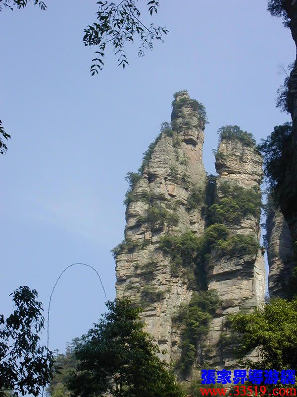 (花果山、水簾洞)孫悟空的花果山水簾洞到了。并不是張家界人過于牽強(qiáng),胡亂把西游記的事兒往這兒湊,實(shí)在是巧合,《西游記》劇組的導(dǎo)游楊潔及唐僧、豬八戒、孫猴子、沙和尚等飾演者,一見到這地方就十分肯定地說:外景地選遍全國,只有張家界才真正是《西游記》筆下的神仙妖魔世界。大家順著我的指向往前看,左前方是帶著僧帽,披著袈裟,嘴中念念有詞的唐僧,緊跟在他后面的那座黑乎乎的石峰當(dāng)然就是沙和尚了;神通廣大的孫猴子半蹲在唐僧后側(cè)手搭涼篷,正在觀察敵情呢;豬八戒哪去了?不用說,不是貪吃貪睡,就是偷偷找小女子搭訕去了,花心去了。