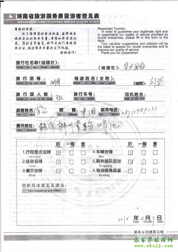 2010年11月7日郴州肖先生一行31位旅游質(zhì)量反饋