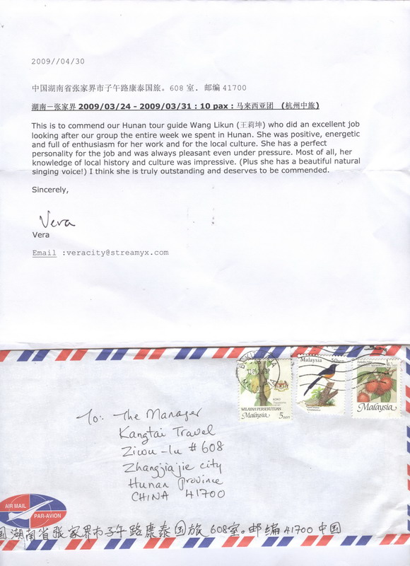 - 游客夏先生為表?yè)P(yáng)導(dǎo)游李姣姣寫(xiě)來(lái)表?yè)P(yáng)信致我張家界... [14811]