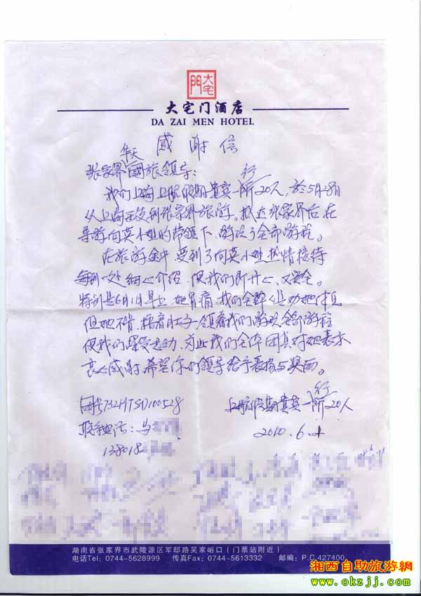 - 游客夏先生為表揚導游李姣姣寫來表揚信致我張家界... [14811]