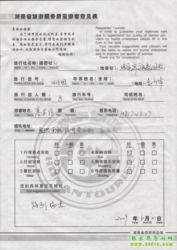 2009年6月18日高先生一行8人接待質(zhì)量反饋單: