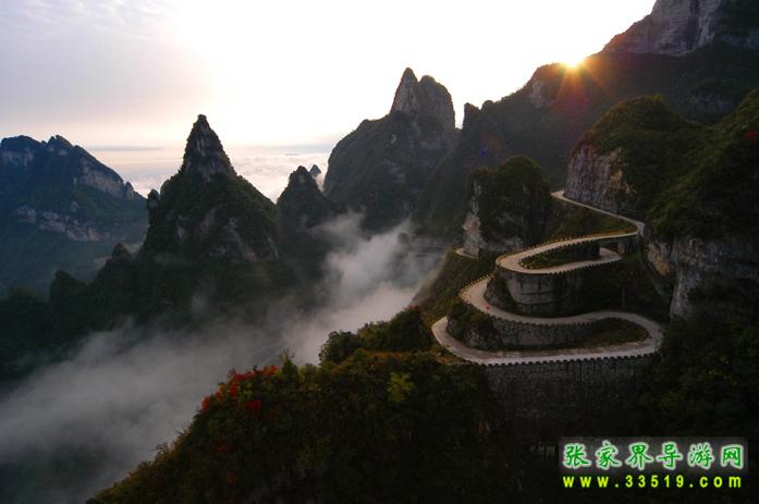 通天大道與天門(mén)山索道、天門(mén)開(kāi)、空中花園并稱天門(mén)山四大奇觀,它共有九十九道灣,在索道上俯看如巨龍騰起,如玉帶盤(pán)纏,直通天際,使人為之震撼,堪稱天下第一公路奇觀。由此可直抵天門(mén)下天梯前。