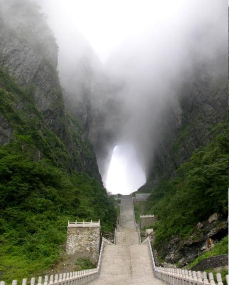 天門(mén)山上有一個(gè)天門(mén)洞,2006年03月,曾有俄羅斯之戰(zhàn)斗機(jī)在此表演飛躍天門(mén)洞的表演,還造成滿(mǎn)大的轟動(dòng)。上天門(mén)洞之前,必須先征服999個(gè)階梯,經(jīng)過(guò)一番努力終于登上天門(mén)洞之后,突有豁然的感覺(jué),人在山上,卻仍然在洞中,從這里更可以鳥(niǎo)瞰整個(gè)張家界市的景色。用完晚餐后,即乘車(chē)從張家界回車(chē)長(zhǎng)沙。